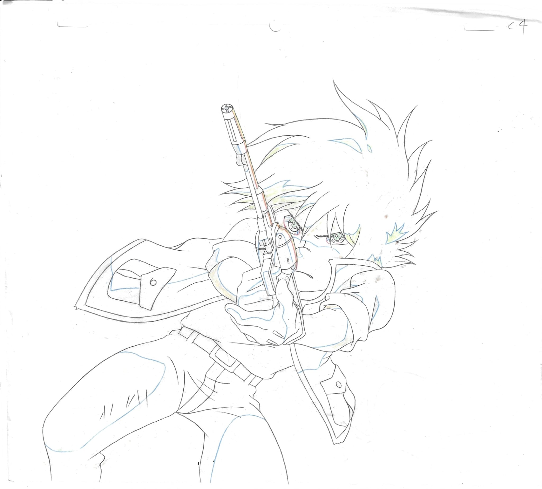 Description: An amazing cel of the main character, voiced by the legendary Hayashibara Megumi, about to aim the iconic space gun from Galaxy Express 999!