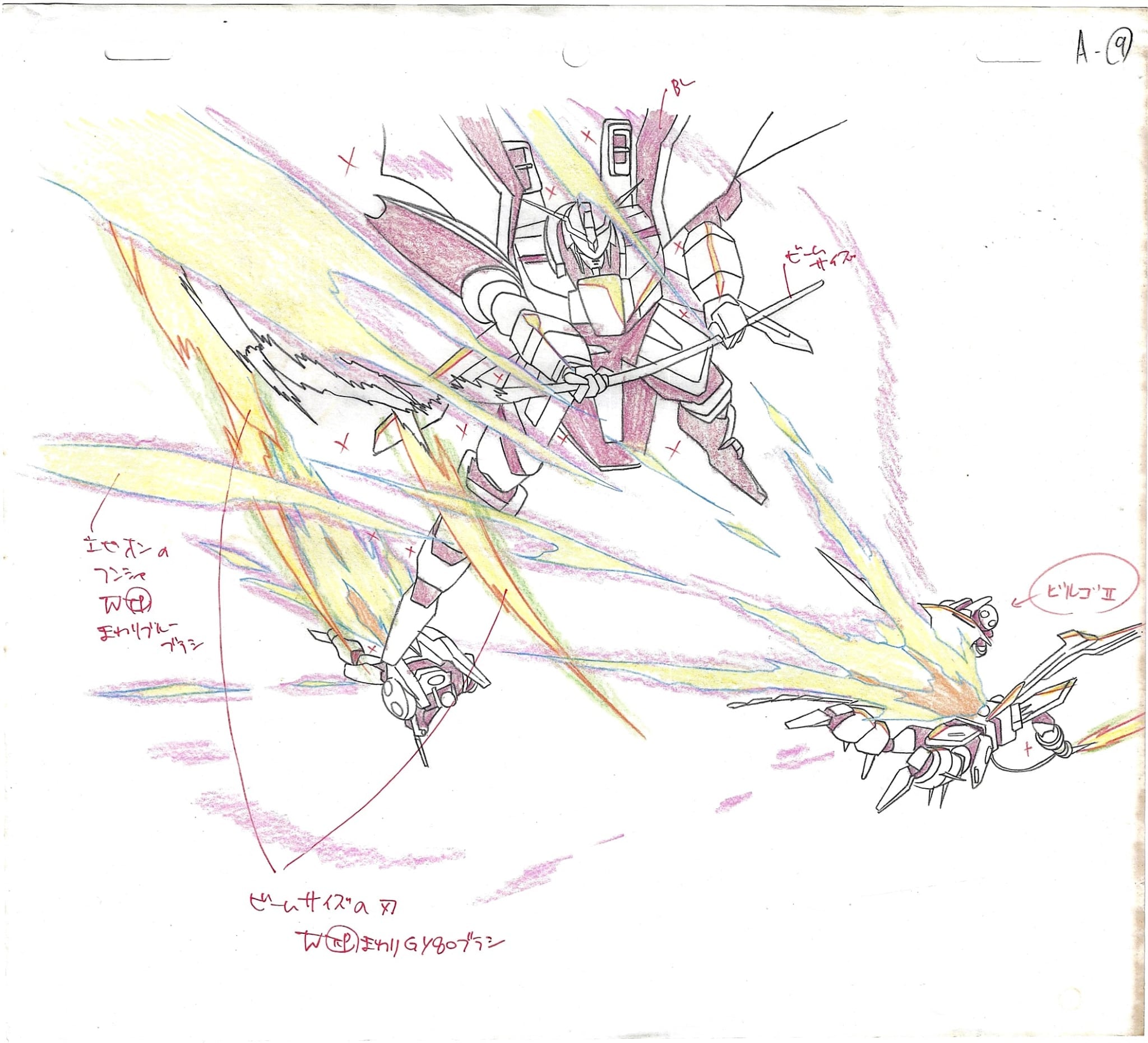 Description: An incredible close-up cel of Kou Uraki's flagship MA reaching for the Folding Bazookas with the claw arms, that almost fills the entire cel!